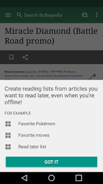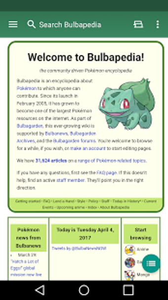 Bulbapedia är den officiella encyklopedin för Pokémon, världens mest populära och bästsäljande TV-spelsserie. Appen har många artiklar om alla tänkbara ämnen, från grunderna i hur spelen spelas och vad de handlar om, till mer ingående artiklar om seriens historia och utvecklingen av varje spel, och mycket mer.